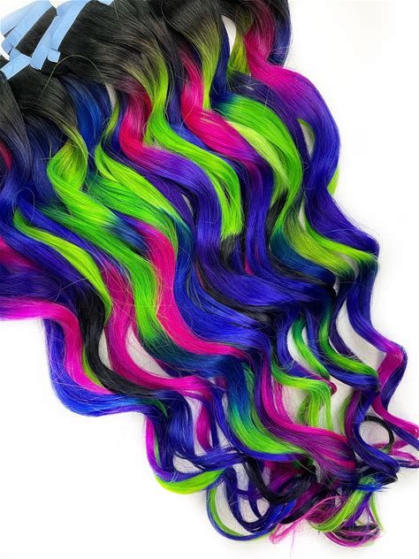 Neon Hair Extensions, Human Hair Weave, Tape In Hair Extensions, Bundle, Clip In Hair Extensions, Neon Green, Black, Purple And Pink Hair.