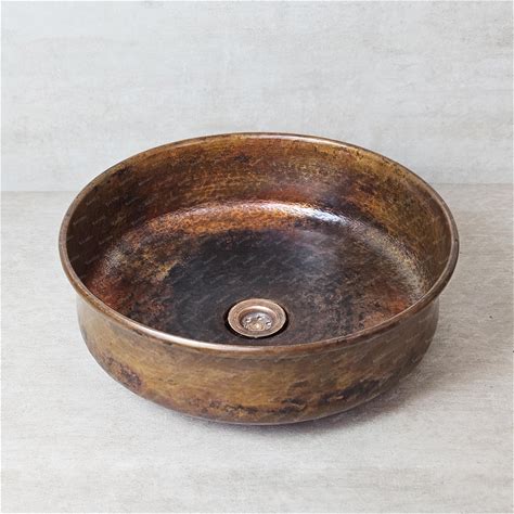 Rustic Copper Bathroom Vessel Sink, Dark Patina, Round Wash Basin