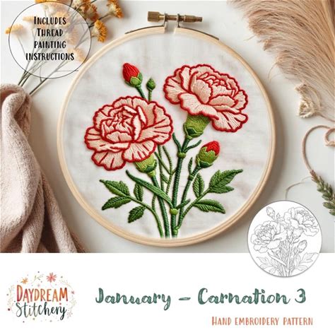 PDF Pattern Hand Embroidery Design: January Carnation 3 (Art Birth Flower Floral Bouquet Thread Painting Botanical Dianthus Caryophyllus)