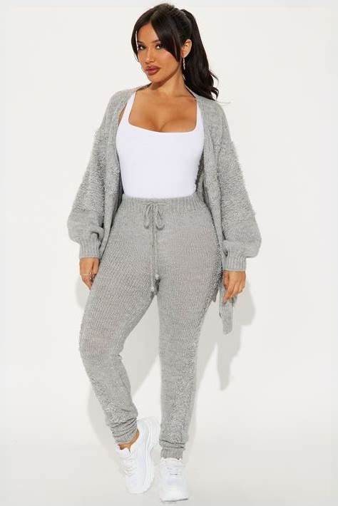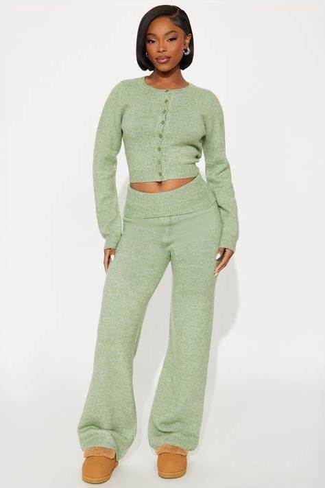 3 Piece Set Long Sleeve Sweater Cardigan Flare Pant Set In Hunter, Size XL For Brunch | Fashion Nova