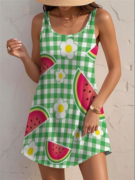 Women's Summer Watermelon Vibe Dress For And Women Cute Green Gingham And Daisy Print Sundress Perfect Mini Day Dress For Picnics Vacations And Everyday Soft Stylish Fashion Dress Ladies Cute Summer Party Night Dress,XL