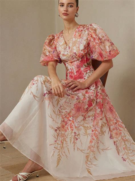 Sweet Ditsy Floral Petal Sleeve Deep V-Neck High Waist Mini Dress Romantic Elegant Vintage-Inspired Gradient Floral Print Dress With V-Neck Design, Puffed Sleeves, And A Fitted Waist. Made Of Lightweight, Breathable Chiffon F