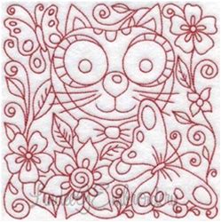 7 Redwork Embroidery Patterns And Finished Block Basket Sampler, Sun, 9 Patch Quilt, Cats, Mittens & Romance. Woman W. Buggy 18" X 17.25"