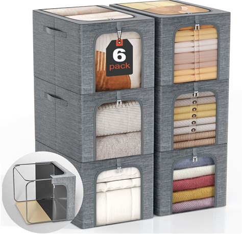 Gomaihe Clothes Storage Bin With Metal Frame: 6-Pack Stackable Closet Storage Bin With Lid & Clear Window, Sweater Boxes Storage For Closet Bedding