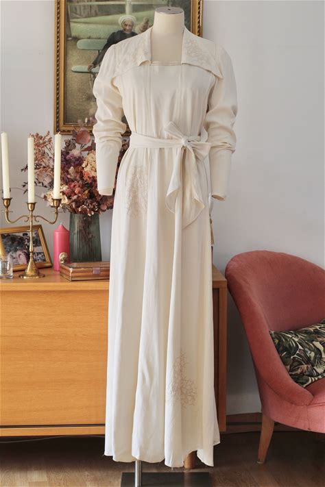 1930S White Satin Embroidered Lace Bridal Wedding Dress Nightgown & Jacket Set