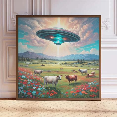Retro UFO Abduction Art Print: Funny Cow & Alien Encounter